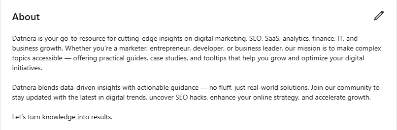 The About (or Summary) section is the first (and possibly the only) text that an HR, client, or colleague will read before deciding whether to continue looking at your profile or leave it. To ensure that the text in this section works in your favor, stick to a simple structure: